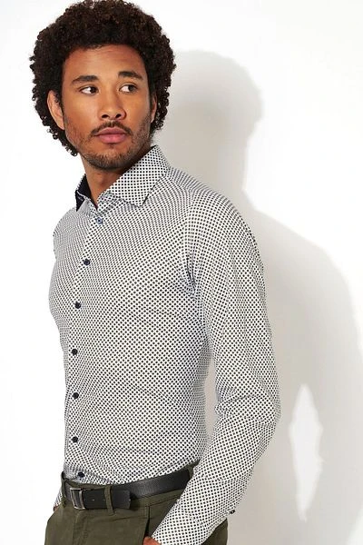 Dit overhemd van Desoto is trendy, functioneel en geeft je outfit een moderne uitstraling. Het witte overhemd heeft een trendy all-over grafische print in een Taupe kleur. Dit shirt is voorzien van lange mouwen met een enkele manchet. Daarnaast is er een 1-knoops, kent boord. Nog een bijkomend voordeel: dit herenshirt is volledig strijkvrij. Hang het overhemd na het wassen op om te drogen, en de volgende dag kun je hem meteen aan!