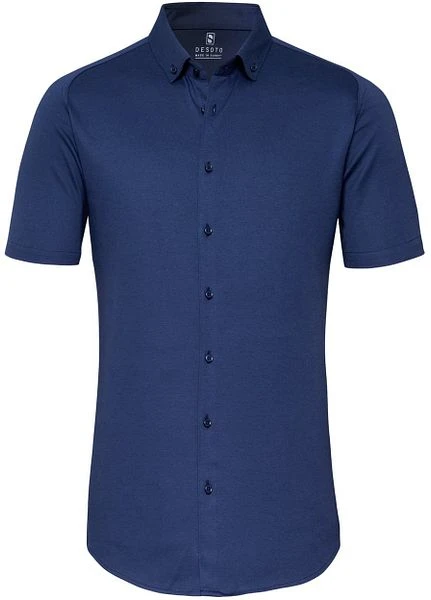 Dit zwarte overhemd van het trendy merk Desoto is een musthave voor elke fashionable man. Dit overhemd heeft een slanke pasvorm en is afgewerkt met een jersey binding, button down kraag en korte mouwen. Doordat dit herenoverhemd gemaakt is van jersey katoen biedt dit shirt extra rekbaarheid en meer bewegingsruimte. Het jersey katoen is bovendien op een hoogwaardige manier gebreid en de stoffen zijn Oeko-Tex gecertificeerd.
