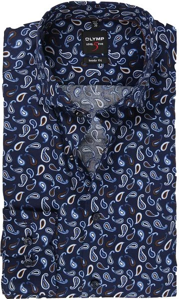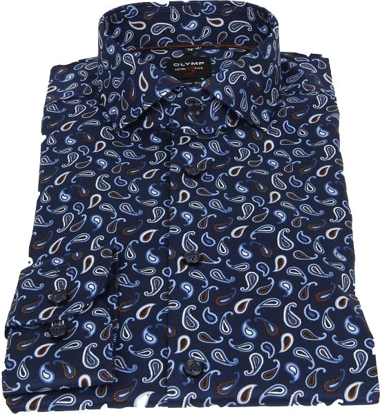 De overhemden uit de Level 5 collectie van Olymp staan bekend om hun slanke pasvorm en stijlvolle look. Dit herenshirt heeft een all-over paisley dessin op een donkerblauwe ondergrond, dit zorgt voor een vrolijke touch en geeft jouw outfit een stijlvolle uitstraling. Daarnaast is het dress-shirt voorzien van een kent boord, enkele manchetten en bijpassende donkergekleurde knopen.