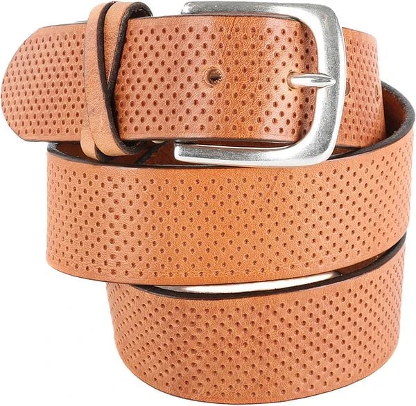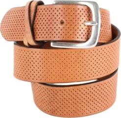 Deze Profuomo Leren Riem Roma Neutral is zoals de naam het zegt basic en neutraal, maar wel met een speels tintje. De riem heeft een lichtbruine cognac kleur en is voorzien van een leuk stipjespatroon. Hierdoor is de ruim heel eenvoudig casual te dragen met een jeans, maar zal hij ook prima passen in uw pantalon. De herenriem heeft een breedte van 4 cm en is voorzien van een nikkelvrije gesp.