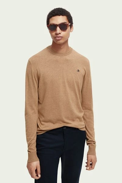 Het Amsterdamse kledingmerk Scotch en Soda is rijk aan details en heeft een uitstekende kwaliteit. De ontwerpers van Scotch laten geen enkel middel onbenut bij het uitwerken en verfijnen van hun kledingstukken, waarbij ook de afwerking van de binnenkant niet wordt vergeten. Deze sweater heeft een stijlvolle Camel Melange kleur, ronde hals, een ton sur ton logo detail en elastische banden aan de uiteinden van de mouwen voorziet je outfit zo van een klassieke look met een herkenbare Scotch & Soda twist.