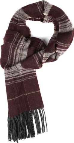 De zachte heren sjaal van Suitable heeft een kleurenpalet van grijs en bordeaux rood en door zijn lengte op vele manieren te dragen. De sjaal heeft een ruit dessin met op de uiteindes franjes.