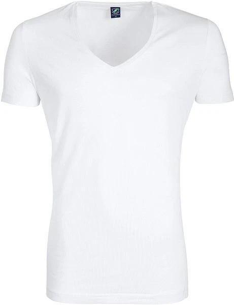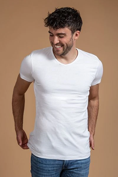 Deze witte Bamboe T-shirts met extra diepe V-hals van ons eigen Suitable label zijn de perfecte basis voor jouw garderobe. Als je kiest voor dit T-shirt in een prachtige luxe kwaliteit Bamboe/Katoen, dan kies je voor een zachte, luchtige en soepele stof, die veel minder plakt aan je huid bij warme dagen. Werkelijk een genot om te dragen, zeker als je gevoelig bent voor huidirritaties. Dit model T-shirt heeft een Slim-Fit pasvorm en valt daardoor getailleerd langs het lichaam. Dankzij de diepe V-hals uitsnede kan je gemakkelijk de bovenste twee knoopjes van je overhemd open dragen, zonder dat het Vibamboru T-shirt zichtbaar is.