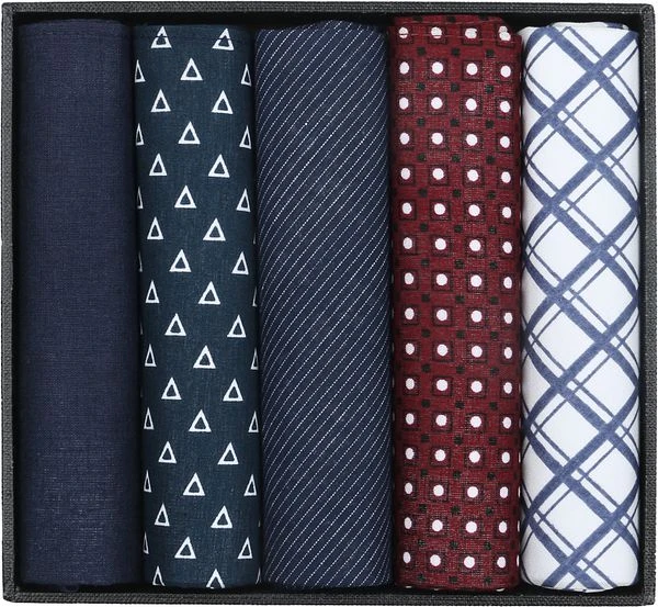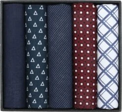 Luxe set met 5 herenzakdoeken, in een stijlvolle blauwe kleur. De zakdoeken hebben allen een divers patroon en voelen comfortabel aan dankzij het zacht geweven katoen. De Hanky modellen hebben een afmeting van 40×40 cm.
